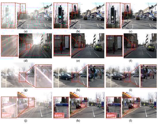 Subsequently, we analyzed the cases of adequate and inadequate restoration of our proposed model. The first and second rows in Figure 19 show the cases where CAM-FRN inadequately removed lens flare in the syn-flare CamVid dataset. In both examples, lens flare generated on top of an object is removed, but the color of the original image is not restored compared with the ground-truth image. In the first row in Figure 19a, a traffic light is located close to a light source, and the intensity of a lens flare from the light source is fairly strong; therefore, the color of the traffic light shown in the original image (b) is not restored properly in the CAM-FRN result image in (c). In the second row in Figure 19d, the object is not located close to the light source as in the first case; however, a strong lens flare completely covers a person in the enlarged part. As a result, the color of a coat on the pedestrian in the original image (d) is not appropriately restored in the CAM-FRN result image in (f). In the third and last rows, the lens flare is effectively removed, and the color of an object covered by the flare is restored fairly adequately. Similar to (a) and (b), the object is covered by lens flare in (g) and (j) in the third and fourth rows, respectively; however, the pedestrians and the details of the building in the enlarged part are preserved adequately.