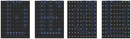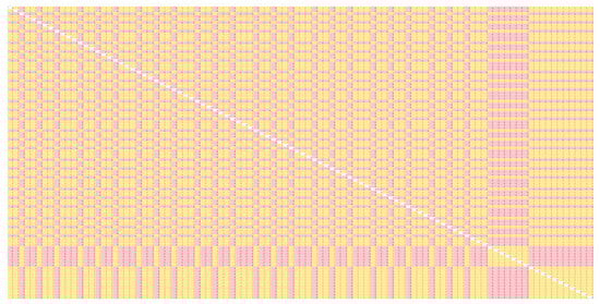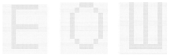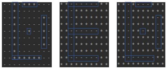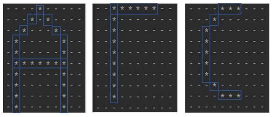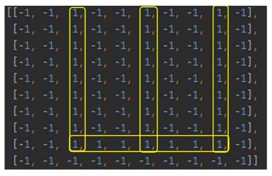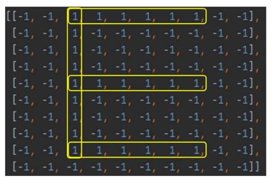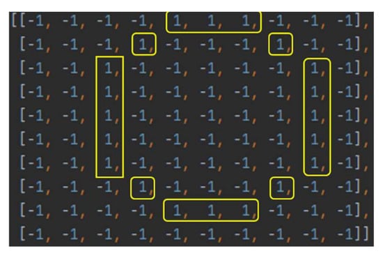 To test the working algorithm from [21], the initial samples were formed in the form of two-dimensional arrays filled with the values −1 and 1. For clarity, they were selected in a pattern similar to the Cyrillic letters “E” (Figure 1), “O”(Figure 2) and “Ш” (Figure 3):