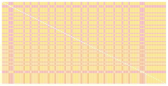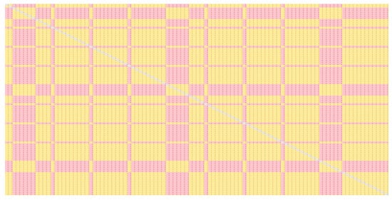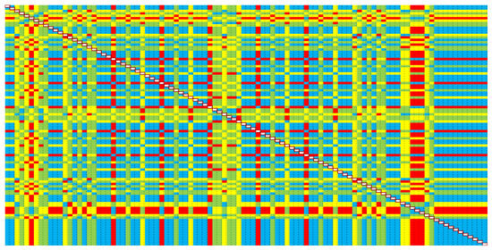The total matrix of weights, W. The red color of the cell corresponds to the value of the sums of weights equal to −3. Yellow: −1; white: 0; green: 1; blue: 3.