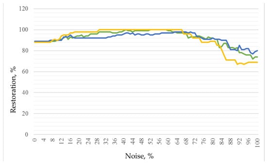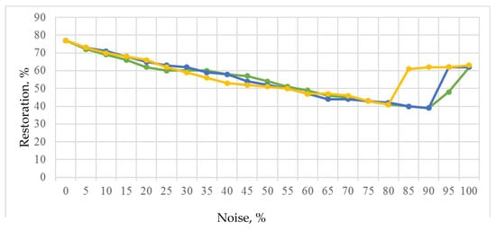 Recovery testing was carried out with a sequential increase in the noise factor of 1% from 0% to 100%. In total, 100 tests were carried out, in each of which the percentage of deviations of the restored sample from the original was calculated and averaged (Figure 9).