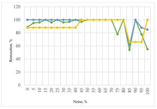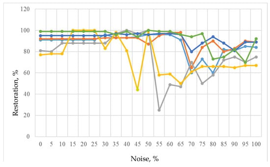 However, for some samples within the proposed algorithm, the recovery is more successful than that for others. Namely, the letter «O» was restored in the range of 0–80%. It was also erroneously recovered when trying to recover other samples with strong noise.