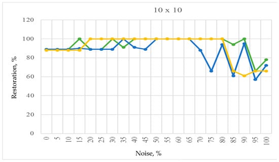 With a low percentage of noise (0–25%), the algorithm restores the image with an error of 1;