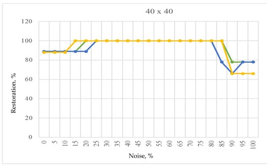 At 70% noise, the algorithm restores the image with an error of 2; at 80% noise, it restores the image with an error of 3; at 85% noise, it restores the image with an error of 2, at 90% there is an erroneous recovery of another sample, “Letter O”; at 90% noise, it restores the image with an error of 3; at 100% noise, it restore the image with an error of 4 (inverted error 1).