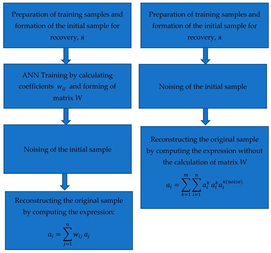 The ANN training procedure is performed by calculating the weight coefficients, , characterizing the connection of neurons (1). Moreover, within the framework of the model [21], it is assumed that this coefficient is equal to zero for the same neuron.