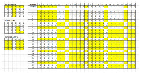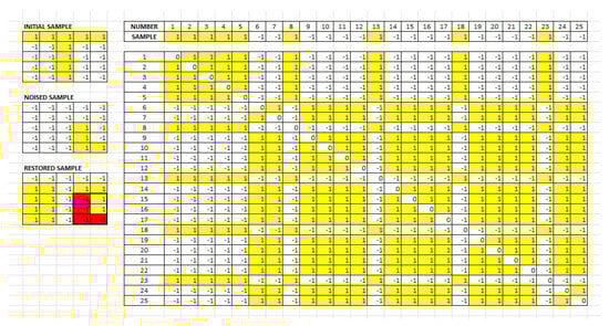 The formation of samples of the considered model of the neural network in order to visualize and simplify the study was implemented in the form of two-dimensional square arrays of various sizes with signal values of ±1. Next, the weight coefficients of interaction between individual nodes (neurons) of the samples formed for training were calculated by calculating the weight coefficients, w. After the completion of the training stage for all samples, a noisy sample was generated and further restored based on the weight coefficients, w.