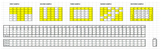 The lines “1—Noise”, “2—Noise”, “3—Noise” reflect the result of the multiplication of samples by the noised signal. The last column of these lines (Sum) shows the correlation of this or that sample in order to analytically represent the influence of this or that sample on the recovery result.