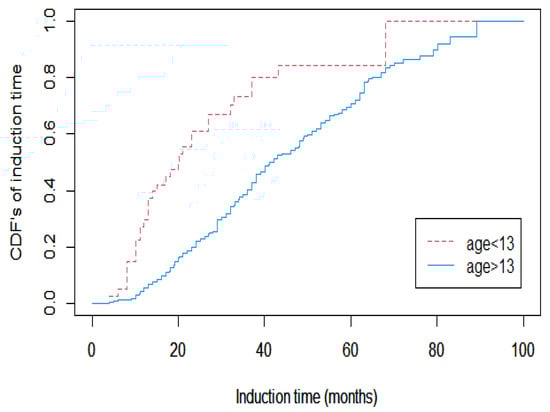 The cumulative distribution functions of induction time for two age groups. The Y-axis represents the cumulative distribution functions of induction time, while the X-axis denotes the induction time in months.