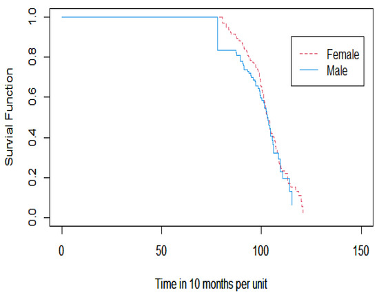 The survival curves of the lifetime for the sex groups. The Y-axis represents the survival curves of the lifetime, while the X-axis denotes the lifetime in units of 10 months.