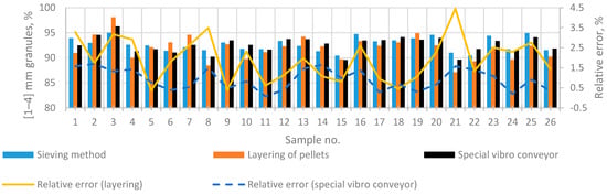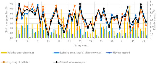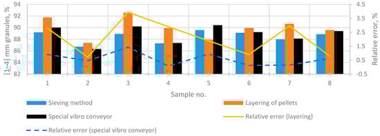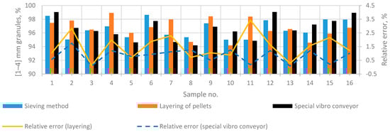 | Measurement no. | Sieving Method, % | Pellets Layering Method, % | Absolute Error, % | Relative Error σ1, % | Special Vibroconveyor, % | Absolute Error, % | Relative Error σ2, % | σ2–σ1, % |