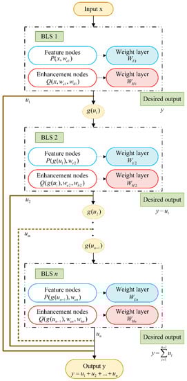 Stacked BLS is defined with n stacked BLS blocks: . The stacked BLS structure diagram is shown in Figure 3. The description of the BLS blocks (different from the original BLS) follows: