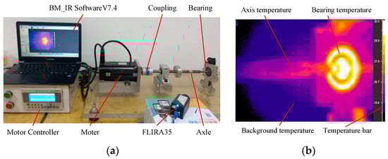 Figure 4a shows the lab bench for infrared video acquisition. Figure 4b shows a sample of the equipment capturing an infrared image. Different faulty bearings and motors are installed on the experimental bench. All other parts are labeled in the figures. In addition, Table 1 demonstrates the types of experimental equipment and the corresponding parameters.
