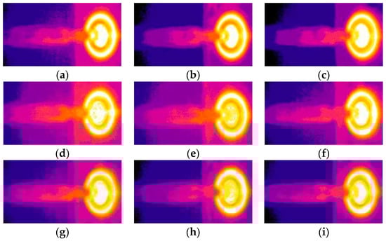 RoI in infrared images of each bearing fault type. (a) HE; (b) HO; (c) IN05; (d) IN10; (e) IN15; (f) OU05; (g) OU10; (h) OU15; (i) RO.