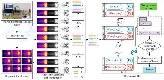 Infrared videos of nine faulty bearings were acquired and infrared images were extracted separately. Subsequently, a series of preprocessing processes, such as grayscale image conversion, region of interest (RoI) acquisition, denoising, and image segmentation were performed on the obtained infrared image. The second-order statistical features were extracted through gray level concurrence matrix (GLCM). Seventy-two features, including energy, contrast, entropy, sum average, variance, and correlation, were obtained from three distances and three angles. Afterwards, IPS was used to select the extracted features. Finally, SSDStacked-BLS was used for fault diagnosis.