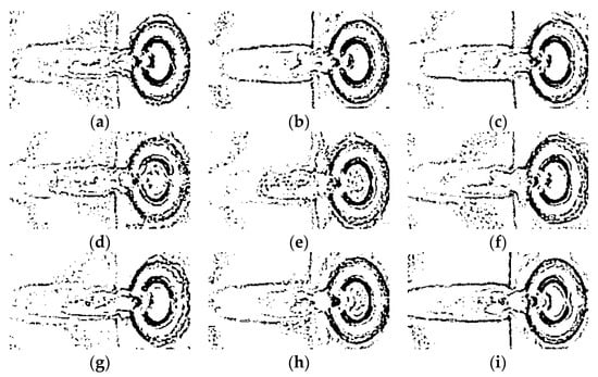 The nine obtained types of infrared images were subjected to RoI cropping, grayscale map conversion, median filtering denoising and adaptive threshold segmentation. The results after pre-processing are shown in Figure 8.