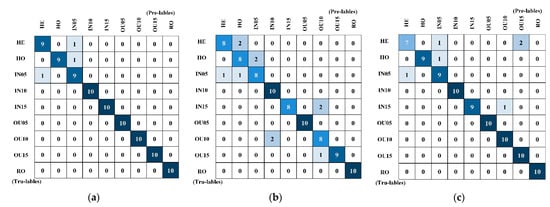 Some information can be seen from Figure 9. In IPS-SSDStacked-BLS, only HE, HO, and IN0 show misclassification. In PCA-SSDStacked-BLS, HE, HO, IN05, IN15, OU10, and OU15 show misclassification. In SVD-SSDStacked-BLS, HE, HO, IN05, and IN15 showed misclassification.