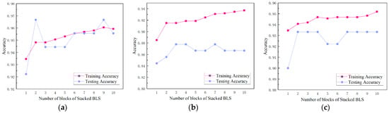 Accuracy of fault diagnosis for different block numbers. (a) IPS-SSDStacked-BLS; (b) PCA-SSDStacked-BLS; (c) SVD-SSDStacked-BLS.