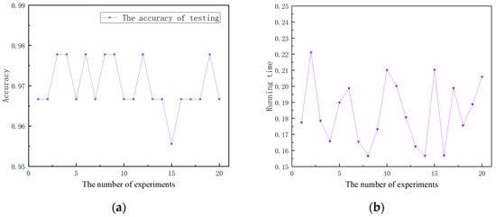 To verify the robustness of the model, 20 experiments were performed on the data. The results are shown in Figure 11. The training accuracy of the 20 experiments is exhibited in Figure 11a, and the running time of the 20 experiments is shown in Figure 11b. Accuracy remained between 0.9556 and 0.9778 for each round of testing. The average value was 0.9700. Running time ranged from 0.15 to 0.23 s with an average value of 0.1837.