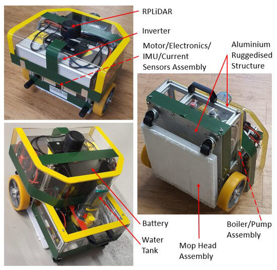 An in-house-developed autonomous steam mopping and disinfection robot suitable for large indoor workplaces is used in this study for data acquisition and real-time case studies. The photos of this wheeled mobile robot with critical components are shown in Figure 2. The maximum size of the robot is 45(L) × 40(W) × 38(H) cm and around 20 kg weight, including the cleaning payload. The robot chassis is built using an aluminum plate and extruded channels for a robust structure, and all the electromechanical and sensor assemblies are fastened to the chassis for smooth and stable locomotion across all the typical indoor floors. A differential wheel drive mechanism is used with two caster wheel supports. Two Oriental motors of 24 V and 1.9 N-m torque brushless DC geared motors (BLHM015K-50) are used for each drive wheel with a closed-loop control function. An RPLiDAR A2 scanner is mounted at the top of the robot with 360 coverage for localization and mapping. A Vectornav VN-100 IMU sensor is firmly mounted on the aluminum base plate at the center portion of the two-wheel axis, enabling navigation. A 24 V 40 Ah Li-ion battery is used to power the whole system, and an NVIDIA Jetson AGX Xavier computer is used to steer the entire operation and data storage. The robot operating system (ROS) melodic framework is used and acts as the middleware to establish all communications. More details of this robot are published in the system architecture paper [47]. A D-Link 4G/LTE mobile router is used for monitoring the robot’s health remotely. A temporary, clear acrylic cover is used to observe the system deterioration during testing.