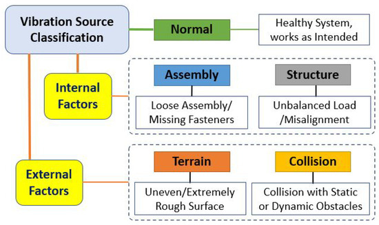A wheeled mobile robot generates aberrant vibration as an early symptom of failure. This could be due to various internal factors such as wear and tear, loose assembly, parts displacement or misalignment, unbalanced weight, etc., raised from the robot itself by continuous use or poor design and assembly. External factors are mainly unintended or uneven and damaged terrain, collision with undetected or unseen objects, or forced external interaction. Hence, by monitoring such abnormal vibration sources, as classified in Figure 3, appropriate maintenance actions can be triggered promptly, avoiding total system failure or incidents. Here, the Normal class is represented as the robot in healthy condition and deployed at its intended smooth operational environments, and any minor natural vibration generated is accepted.