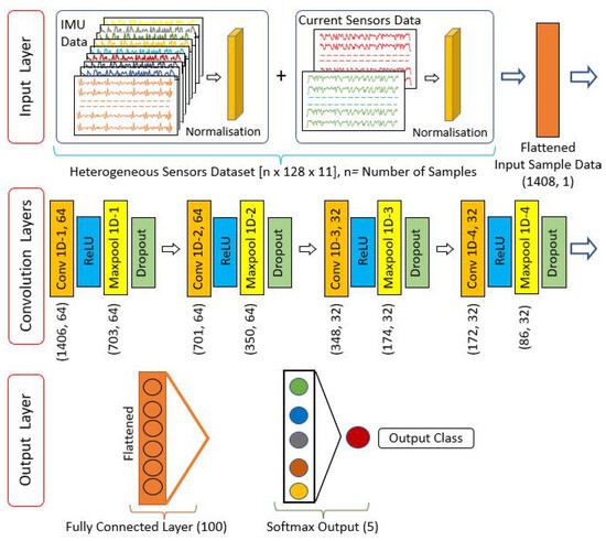 The input vibration data for 1D CNN training is compiled into an array of [n × 128 × 11], where n is the total number of samples. Hence, the compiled/fused dataset is flattened into a 1D array [1 × 1408] and fed into 1D convolution. The convolution structure is made simple with only four layers and uses 64 filters for the first two layers and 32 for the rest. All layers used a convolution window (kernel) size of 3. The rectified linear activation unit (ReLU) is applied to each convolutional layer to learn the complex nonlinear pattern of vibration-affected heterogeneous sensor data. After each convolution layer, a max-pooling layer with a stride size of 2 is added to reduce the computation time. Further, a dropout layer is added at a rate of 0.2 for each layer to prevent over-fitting while training. Finally, the pooled feature maps are converted to a 1D array using a flattening function in the output layer to predict the multinomial probability of vibration source classes. The structure of this 1D CNN-based model proposed is illustrated in Figure 5.