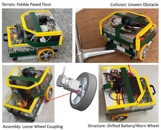 Preparing a qualitative and quantitative training dataset representing each vibration source class for 1D CNN training and evaluation is critical in this study. Hence, we modified and exposed the robot inducing the four abnormal vibration classes. For Terrain class data, we drove the robot through typical but undesired terrain features for an indoor robot, such as small-pebble-paved and uneven/unstructured/damaged indoor floors. Similarly, exposed colliding with potentially unseen/undetected common static obstacles such as table bases, thin legs of tables, and glass doors, also externally applied forces such as collision with dynamic objects, to collect the collision-induced data. Further, various critical components were loosened for the Assembly class, such as wheel couplings, mounting brackets, and mopping heads. Finally, the robot was modified by shifting the heavy components, such as the battery, boiler assembly, etc., from their designed location, also causing an unbalanced system with a more worn-out wheel for collecting unstable Structure class vibration-affected data. The Normal class data were collected, deploying the robot in good condition in terms of the robot’s health and deployed workspace. Some of the modified and exposed cases for anomalous classes are illustrated in Figure 7. As the robot is used for steam mopping and disinfection, all the tests were performed by driving at the intended linear speed of 0.05 m/s and angular speed of 0.4 rad/s with typical cleaning patterns, mainly straight and zig-zag.