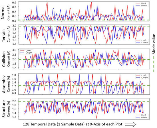 The raw data collected from both IMU and current sensors are visually represented, plotting time–amplitude and time–current graphs for each vibration source class, as shown in Figure 8 and Figure 9. This depicts the change in linear and angular motion and current consumed across the different classes. For IMU data features, the three axes’ data are plotted in the same graph, and here, the linear acceleration in the Z-axis is brought to the same scale for plotting and visualization. Similarly, current data readings from the left and right motor are plotted in the same graph. In both plots, randomly selected sample data, i.e., 128 temporal data acquired over 1.6 s, are used.