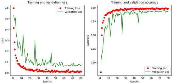 A supervised learning strategy was applied to train the unique dataset, compiled as explained in the previous sections, using the Tensorflow DL-library [50] and the Nvidia GeForce GTX 1080 Ti-powered workstation. A K-fold (K = 5) cross-validation technique was applied for generalization and to avoid over-learning to ensure the dataset quality. Here, the datasets were split into k subsets, where k − 1 subsets are to train the model and the remaining to evaluate the model’s performance. Momentum with gradient descent optimization strategy was applied to speed up learning and help not to get stuck with local minima. We tested with different hyperparameters for training for optimum results and opted as follows. An adaptive moment optimization (Adam) optimizer [51] with a learning rate of 0.001 and an exponential decay rate of 0.9 for the first and 0.999 for the second moment was used. A categorical cross-entropy loss function was applied to assure minimum loss while compiling the model, which fits better for this multinomial classification and probability prediction. The model with a batch size of 32 and an epoch size of 80 showed better performance, as plotted in Figure 10, showing the loss and accuracy curve graphs for training and validation.