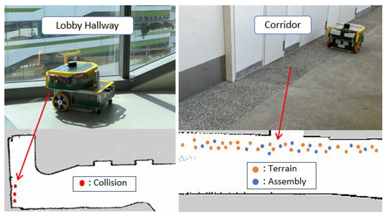 The second case study was tested in a carpeted lobby hallway where one wall was built using transparent rugged glass. During the robot’s drive near the glass wall, the RPLiDAR did not precisely detect the transparent glass wall, resulting in occasionally hitting the wall. We stopped the robot to avoid damage to the robot, glass wall, and other potential hazards. Next, the robot was driven in a mixed concrete and small-pebble-paved corridor for the third field trial. During the trial runs, the Terrain-induced vibration class is predicted and fused on the map whenever the robot moves to the pebble-paved floors. As it was an isolated area with no workspace hazards, we continued the testing on the same pebble-paved floor without any maintenance action. However, after six days, intermittent Assembly-induced vibration classes were observed along with the Terrain class, mainly due to the loose assembly of wheel couplings with motors. Figure 12 shows the 2D CbM maps for case studies at the lobby and corridor, indicating some of the randomly selected fused vibration classes in real-time towards the end of the test, also the workspace photos.