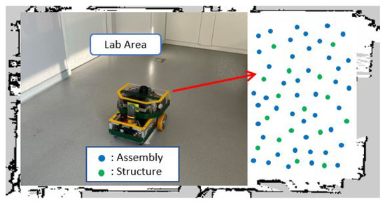 Finally, we conducted a long-term test drive by isolating a small area (around m) of the robotics lab with a vinyl floor and removing all obstacles, i.e., tested with no potential external factors. The robot ran continuously with timely recharging for 21 days without any abnormal classes predicted. However, apparent wheel wobbling was later observed, and Assembly-induced vibrations were fused on the SLAM map concurrently. We continued the test without any maintenance; hence, the condition worsened. Detaching the battery bracket and mopping pad assembly resulted in parts shifting and Structure-induced class prediction. These intermittent Assembly and Structure classes predicted/fused for the last few samples before stopping the robot are shown in the 2D CbM map Figure 13 with the lab test area photo.