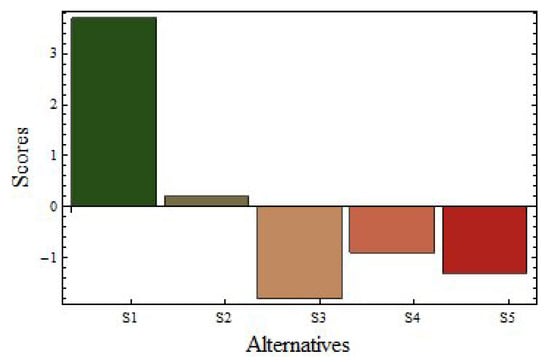 In Figure 3, the bar chart serves as a visual representation of the alternative values derived from the evaluation criteria outlined in Table 12. The chart allows for a clear and concise comparison of the different schools (, , , , and ) based on their respective scores.