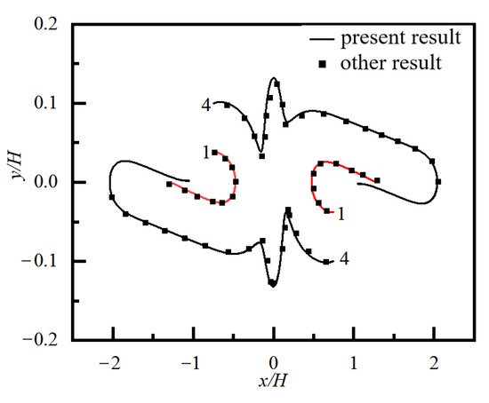 The motion trajectory of a pair of particles with an initial distribution on either side of the centerline in a simple shear flow of a Newtonian fluid without obstacles is shown in Figure 2, where the numbers 1 and 4 represent the two initial positions of the particle pair. The present result is in good agreement with the result given by Yan et al. [41].