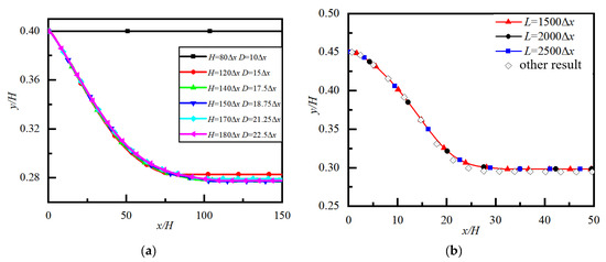 In order to validate that the numerical results do not depend on the number of grids, the numerical results of particle trajectories in channel flow with different channel heights, H, and particle diameters, D, are shown in Figure 3a. For balancing computational efficiency and accuracy, D = 22.5Δx and H = 150∆x are selected in the following numerical simulation.