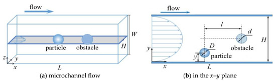 Lateral migration and the lateral equilibrium position of particles in a microchannel flow of Newtonian and power-law fluids with an obstacle are studied. As shown in Figure 4, the influence of the upper and lower walls on the flow in the x–y plane with z = 0.5 W can be ignored when H/W ≤ 0.5, so the migration of a neutrally buoyant particle in the x–y plane (cross-section) is considered. A circular obstacle is located on the centerline of the x–y plane, and a particle enters the flow along the x–y plane from the left of the microchannel. The initial streamwise distance between the particle and obstacles is l = 90Δx, and the initial lateral position of the particle is y. Reynolds number is defined as Re = ρU2-nHn/m, where ρ is the fluid density, U is mean velocity, H is channel height, m is the flow consistency coefficient, and n is the power-law index. The blockage ratio is defined as k = D/H.