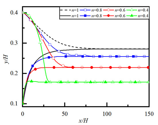 Firstly, the lateral migration and equilibrium position of particles without obstacles are considered. The initial positions of the particles are at y/H = 0.4 and 0.1, respectively. Particle trajectories for different power-law indexs, n, are shown in Figure 5, where we can see that the final equilibrium position of the particle is yeq/H = 0.28 when the particle migrates in Newtonian fluid (n = 1), while the final equilibrium positions of the particle are yeq/H = 0.26, 0.22 and 0.17, respectively, when the particle migrates in shear-thinning fluid with n = 0.8, 0.6 and 0.4. It can be seen that as long as the power law index of the fluid is the same, a particle initially located at different lateral positions will eventually reach the same lateral equilibrium position, which is exactly the so-called SS effect mentioned earlier. The smaller the power law index n of the fluid, the closer the lateral equilibrium position of the particle is to the wall.