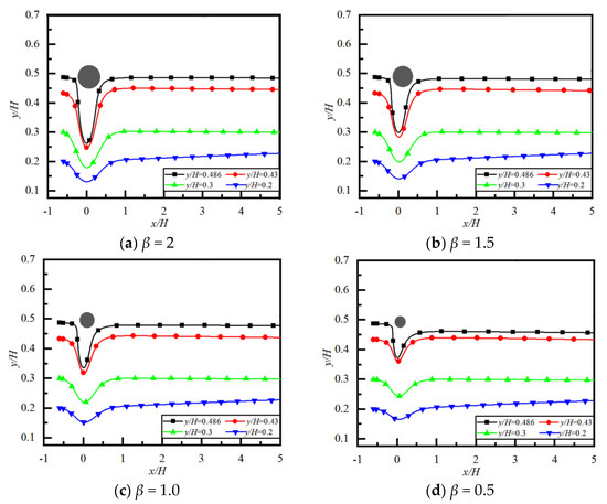The ratio of obstacle diameter to particle diameter is defined as β = d/D. When there is an obstacle with different β in the flow, how to change the particle trajectory after flowing around the obstacle is the topic to be discussed in this section. The particle trajectories for different β and initial lateral positions y/H (at x/H ≤ 5, i.e., situation near obstacle) are shown in Figure 6, and particle lateral positions at x/H = 5 for different β and y/H are listed in Table 1. It can be seen that (1) When a particle with a different initial y/H migrates around an obstacle, it first moves toward the wall, then toward the centerline, and finally downstream in a different lateral position. (2) A particle with a different initial y/H has different lateral positions at x/H ≤ 5 after migrating around the obstacle, which is different from the situation when there is no obstacle, as shown in Figure 5, where the final lateral equilibrium position yep/H = 0.28 regardless of the initial y/H. (3) The particle lateral positions after migrating around the obstacle are very close to those of the initial y/H. (4) In Table 1, the larger the value of β (i.e., the larger the obstacle size), the closer the particle’s lateral position is to the centerline. Based on the above results, the lateral position of particles can be controlled by changing the obstacle size in the wake zone of the obstacle.