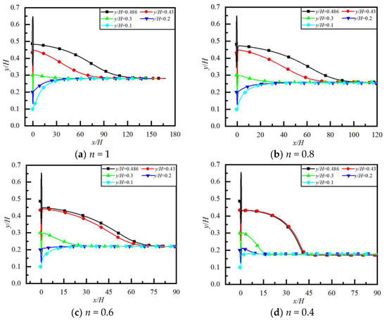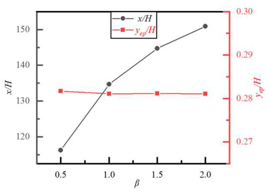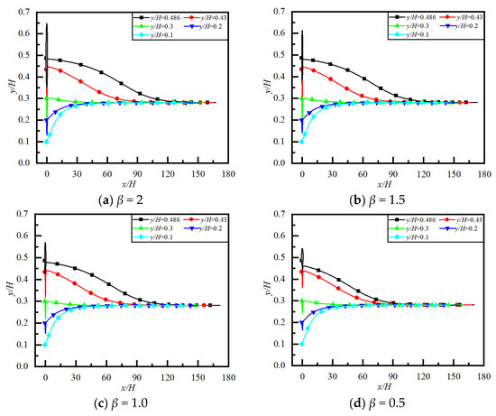 Figure 7 shows the particle trajectories for different β and y/H at 0 ≤ x/H ≤ 180 (situations far downstream of the obstacle). It can be seen that, far downstream from the obstacle, the particle initially located at different y/H tends to the same lateral equilibrium position. This is because the influence of the obstacle on the flow has disappeared far downstream from the obstacle, and the lateral equilibrium position of the particle is the same as when there is no obstacle. Figure 8 shows the equilibrium positions of particles initially located at different y/H and the flow distance required for particles to reach the equilibrium position for different β. We can see that, for the same n, Re and k, the equilibrium positions of particles are almost the same for different β, indicating that the obstacle size has no effect on the equilibrium position of particles far downstream. However, the flow distance required for the particle initially located at a different y/H to reach the same lateral equilibrium position is different when β is different. The larger the value of β (i.e., the larger the obstacle size), the longer the flow distance required for the particle to reach the equilibrium position. The reason is that the larger the value of β, the greater the impact of the obstacle on particle migration and trajectory.