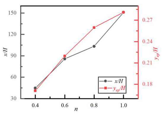Particle trajectory and lateral equilibrium position yep/H for different n and y/H are shown in Figure 9, where we can see that particles with different initial y/H reach the same yep/H after migrating around obstacles. However, for different n, the values of yep/H are different, and the flow distances required for particles to reach yep/H are also different. Figure 10 displays the yep/H of particles with different initial y/H and the required flow distance to reach yep/H for different n. It can be seen that the larger the value of n (i.e., the weaker the shear-thinning effect), the closer yep/H is to the centerline, which is the same conclusion as in Figure 5 and is consistent with the conclusion of Jeffri and Zahed [43] that the enhancement of the fluid shear-thinning effect will cause yep/H to move toward the wall. On the other hand, the flow distance required for particles to reach yep/H increases with increasing n. The reason may be attributed to the fact that the larger n, the weaker the shear-thinning effect of the fluid, the greater the viscous resistance of the fluid, and thus the stronger the effect of resisting the particle toward yep/H.