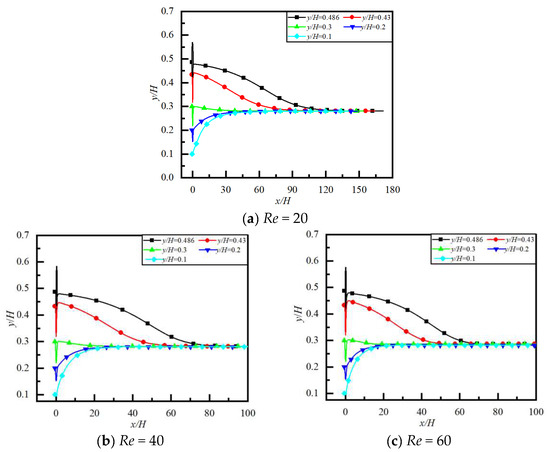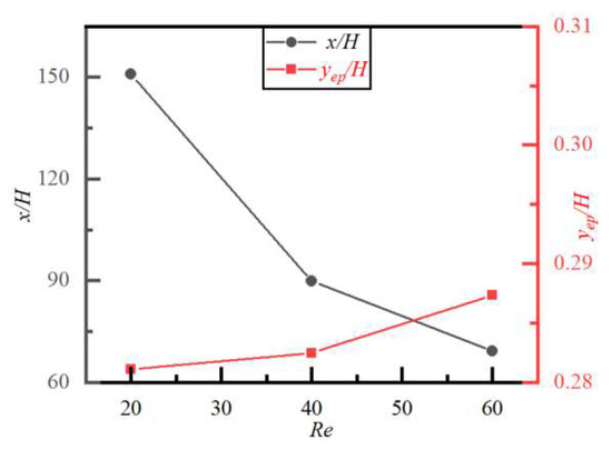 Figure 11 and Figure 12 show the particle trajectory, the lateral equilibrium position yep/H, and the required flow distance to reach yep/H for different Re and y/H. The particle with a different initial y/H finally reaches yep/H after migrating around obstacles for different Re. In the three cases of Re taken in the text, although the difference in yep/H is not significant, the larger the value of Re, the closer yep/H is to the centerline. Nakayama et al. [44] also found that, in the flow of circular tubes at 100 ≤ Re ≤ 1000, yep/H is relatively close to the wall at Re = 100, while it is relatively close to the centerline at Re = 1000. The lateral migration of particles is mainly controlled by inertial forces, which are mainly composed of two parts: the first is the force induced by the parabolic velocity profile that points toward the wall, and the second is the force directed toward the centerline, caused by the symmetry destruction of the wake of particles due to the influence of the wall. When Re is large, the influence of the latter is greater than that of the former, so yep/H is closer to the centerline. In Figure 12, the smaller the value of Re, the longer the flow distance required for particles to reach yep/H. This is because the viscous effect is stronger than the inertial effect under small Re, which has a strong resisting effect on the particle moving toward yep/H.