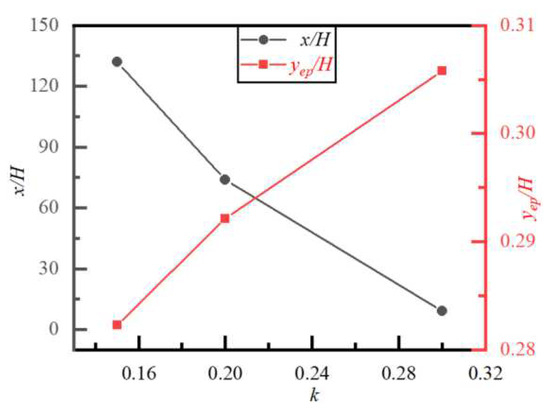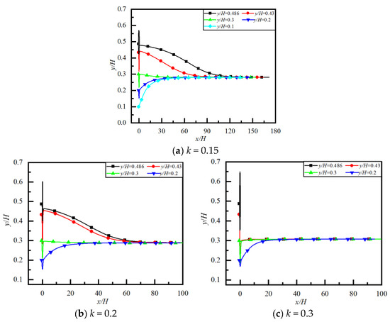 Particle trajectory, lateral equilibrium position, and required flow distance to reach the equilibrium position yep/H for different k and y/H are shown in Figure 13 and Figure 14, respectively. We can see that the particle with a different initial y/H also finally reaches yep/H after migrating around obstacles for different k. The larger the value of k, the closer yep/H is to the centerline. This is because the larger k corresponds to a larger particle (while the channel height H remains constant), and the wall effect has a more significant impact on the symmetry destruction of the wake of a large particle, while the force generated by the symmetry destruction is directed toward the centerline. In Figure 14, the larger the value of k, the shorter the flow distance required for particles to reach yep/H. The reason for this is the same as in the case of Re discussed earlier, i.e., a larger particle (a larger k) means a larger Re while the velocity and viscosity remain constant. At a larger Re, the inertial effect is stronger than the viscous effect, which has a weaker resisting effect on the particles moving toward yep/H. So, the flow distance required for a particle to reach yep/H is shorter in the case of a larger k.