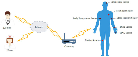 The Internet Health of Things (IoHT) [10,11,12] is an extension of the IoT specifically focused on healthcare. It combines modern communication and medical information technology to create a new mode of health management. The IoHT enables the real-time monitoring of patients’ health data, reducing the repetitive workload for medical staff. Simultaneously, it allows medical professionals to provide timely diagnosis and treatment based on the collected data, as well as deliver preventive or proactive healthcare services at a lower cost. The architecture of the IoHT, as illustrated in Figure 1, includes three main entities: users (doctors/nurses), gateway, and sensor nodes. Sensor nodes are distributed among patients and are responsible for collecting various health data, such as electrocardiogram readings, body temperature measurements, and blood oxygen saturation levels. The gateway serves as a semi-trusted entity that facilitates the real-time transmission of the collected data between the sensor nodes and the users. Users are medical staff (doctors/nurses) who have the ability to access patients’ health data, and use the collected data to analyze the condition and provide appropriate diagnosis and treatment plans for patients.