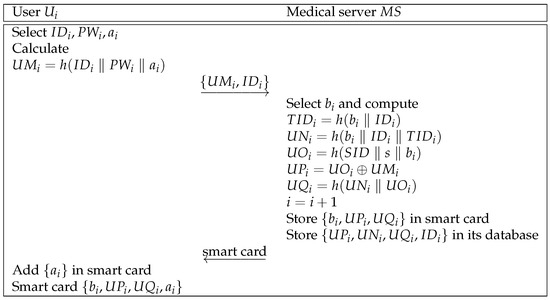 - On receiving the , firstly searches for the stored in the database. If the exists, the should be asked to send a new . Otherwise, selects to compute , , , , , and . Then, stores in smart card, and stores in its database. Finally, transmits smart card to .
