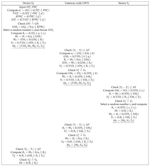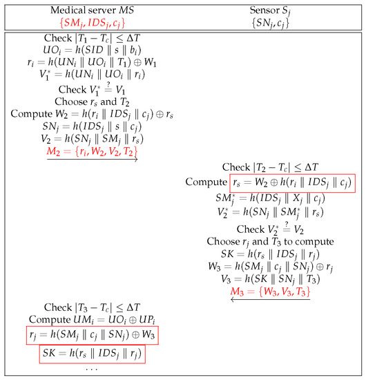 - Following the receipt of message , initially verifies that timestamp is fresh. Next, retrieves from the database using and calculates , , , , and checks . If they are equal, retrieves according to and computes , . At last, retrieves the current timestamp to compute and transmits message to .