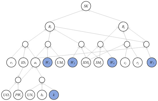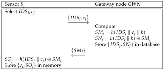 The smart device, gateway, and sensor nodes need to write basic arithmetic functions, such as , ⊕, and . Here, is a semi-trusted entity, which means that it possesses the ability to engage in misconduct, yet lacks the capacity to collaborate with other entities. Moreover, the chooses k as its private key, and is responsible for the pre-deployment of the sensor nodes. The sensor pre-deployment process is shown in Figure 6. The specific steps are described below.