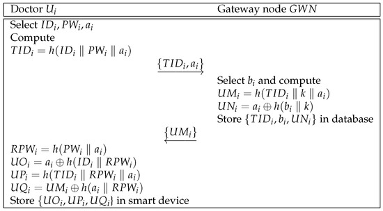 In response to the identified weaknesses of Amintoosi et al.’s protocol, we propose an enhanced AKA protocol in the IoHT (shown in Figure 1). The entities involved in the protocol include , , and . Here, we use to replace the in Amintioosi et al.’s protocol, because the functions of the and the are the same, and the is commonly used in the IoHT environment. The initialization, registration, and login and authentication phases are included in our proposed protocol.