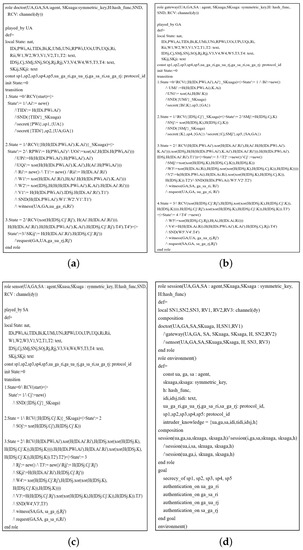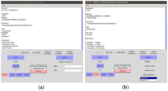- Armando, A.; Basin, D.; Boichut, Y.; Chevalier, Y.; Compagna, L.; Cuéllar, J.; Drielsma, P.H.; Héam, P.C.; Kouchnarenko, O.; Mantovani, J.; et al. The AVISPA tool for the automated validation of internet security protocols and applications. In Proceedings of the Computer Aided Verification: 17th International Conference, CAV 2005, Edinburgh, UK, 6–10 July 2005; Springer: Berlin/Heidelberg, Germany, 2005; pp. 281–285. [Google Scholar]