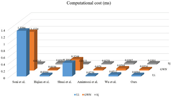 The computational costs of a few in each protocol are illustrated in Figure 13a. Soni et al.’s protocol [23] utilizes point scalar multiplication and fuzzy extractor, and Shuai et al.’s protocol [35] relies on symmetric key encryption/decryption. As a result, both of them incur relatively high computational costs for compared to the other protocols in the comparison. On the other hand, the computational costs of in the remaining protocols show little variation and are relatively lower compared to Soni et al.’s and Shuai et al.’s protocols. Figure 13b depicts the computational costs of a few in each protocol. In our proposed protocol, the computational costs of are higher than in some other protocols, but still lower than the costs in Hajian et al. [33] and Wu et al. [47]. It is worth noting that Hajian et al.’s protocol is the same as that in Wu et al.’s work. Overall, Soni et al.’s and Shuai et al.’s protocols have relatively higher computational costs for due to their specific cryptographic operations.