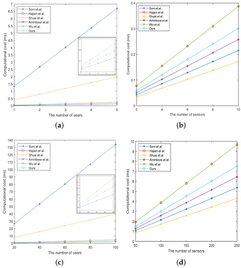 The computational costs for users and sensors [23,29,33,35,47]. (a) Computational cost with few users. (b) Computational cost with few sensors. (c) Computational cost during user surge. (d) Computational cost during sensor surge.
