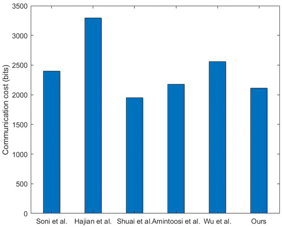 In the comparison of communication costs, the lengths of the identity, timestamp, hash function, random number, point multiplication, and symmetrically encrypted ciphertext are defined to be 160, 32, 256, 128, 320, and 256 bits, respectively. Here, the communication cost is illustrated using our protocol as an example. The messages , , , and , in which is identity, are random numbers, are hash values, are timestamps. Based on the above calculation, our proposed protocol’s communication cost is bits. Soni et al.’s protocol [23] is bits, Hajian et al.’s protocol [33] is bits, Shuai et al.’s protocol [35] is bits, Amintoosi et al.’s protocol [29] is bits, and Wu et al.’s protocol [47] is bits. Based on the data presented in Table 7 and Figure 14, it is evident that our proposed protocol exhibits a slightly higher communication cost compared to Shuai et al.’s protocol [35]. However, our proposed protocol still maintains lower communication costs compared to Soni et al. [23], Hajian et al. [33], Wu et al. [47], and Amintoosi et al. [29].