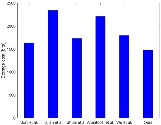 In the comparison of storage costs, the lengths required for various parameters are consistent with the assumptions in Section 5.2.2. Here, we take the registration phases of our proposed protocol as an example. The storage costs required for , , and are bits, bits, and bits, respectively. The storage cost required for our proposed protocol is 1472 bits. The total storage costs for each protocol are presented in Table 8. From Figure 15, it is evident that Hajian et al.’s protocol [33] demands the highest storage costs. In contrast, our proposed protocol requires the minimum storage costs.