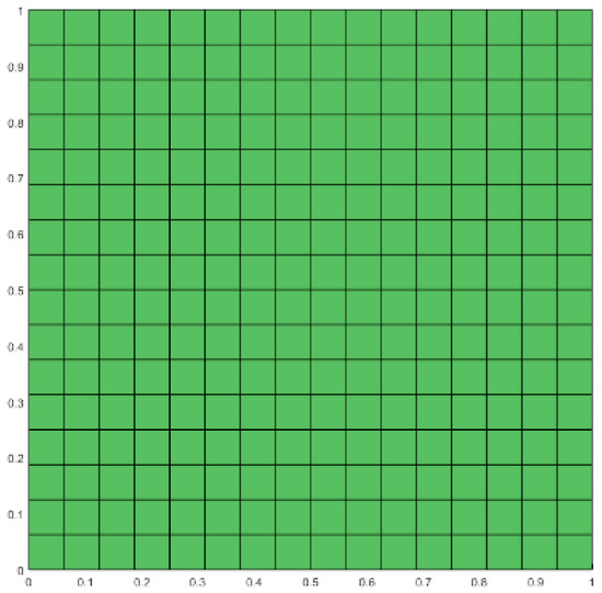 A square geometry, defined as the set [0, 1] × [0, 1], and the control mesh of its NURBS representation 16 × 16.